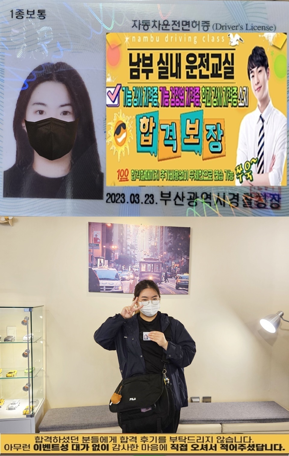 운전면허학원을 알아보던 중 합격자 후기가 가장 많았던 남부운전교실을 알게 되었고, 다른 곳보다 아주 괜찮은 가격대와 스케줄 조정이 편하다는 점이 마음에 들어 학원에 오게 되었습니다. 선생님께서도 아주 친절하셨고 수업이 알기 쉽게 진행되어 금방 운전을 터득할 수 있었습니다.^^ 시험당일 긴장한 탓에 쉽진 않았지만, 운전시험 자체는 어려움 없이 수월하게 통과했습니다. 저도 이제 운전할 수 있어용~!!*^^*