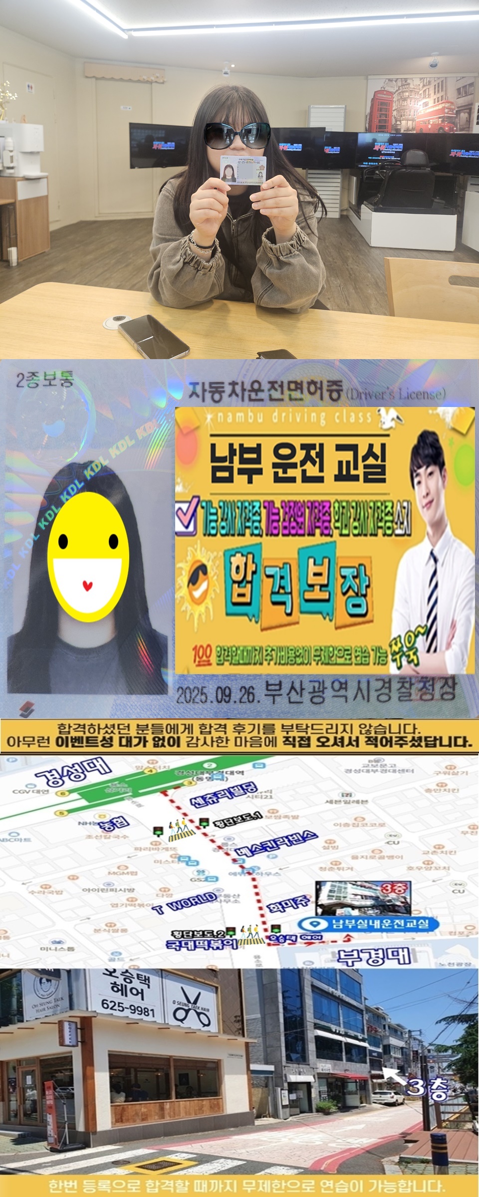 일반 운전 학원은 시간이 안 맞아서 찾아보다가 남부 실내 운전 교실로 선택했습니다. 늦게 까지도 연습할 수 있어서 좋았어요! 선생님도 친절하게 잘 가르쳐주셔서 쉽게 이해 가능 했습니당. 덕분에 10일 정도 만에 면허 따기 성공했습니다~~!~!~!